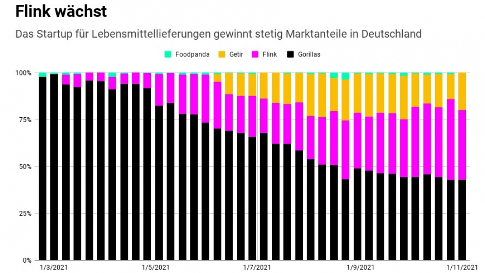 Derweil hat die Berliner Neobank seine Nutzerdaten durchleuchtet und dabei interessante Rückschlüsse auf die Branche der Lieferdienste ziehen können. Aus einer aktuellen Analyse von Vivid geht ein weiteres Startup hervor, welches sich auf der Überholspur befindet. Die Zahlen zeigen, dass Flink schon bald zum beliebtesten Lebensmittellieferdienst in Deutschland werden und damit seinen größten Konkurrenten Gorillas überholen könnte. Das Berliner Startup Flink hat in den letzten Monaten kontinuierlich Marktanteile gewonnen und wächst damit schneller als seine etablierten Konkurrenten. Die Studie von Vivid analysiert Daten von mehr als 100.000 Nutzern und vergleicht dabei die vier größten Lebensmittelliederdienste Gorillas, Flink, Getir und Foodpanda. Dabei sind rund 60 Prozent aller Vivid-Nutzer zwischen 20 und 35 Jahre alt. Dies verdeutlicht, dass die beiden Startups Vivid und Flink zu den neueren Marktentwicklungen gehören, die eher von der jüngeren Generation genutzt wird.